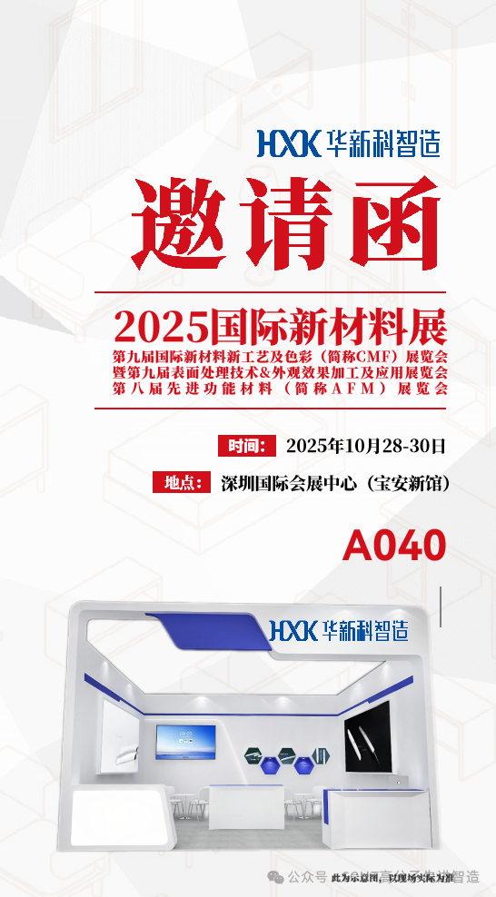 广州华新科智造技术有限公司将携在线流变测试仪、ES新型螺杆技术、高端功能薄膜连续双向拉伸实验线等产品亮相2025年10月28-30日的第九届国际新材料新工艺及色彩(简称CMF)展览会暨第九届表面处理技术&外观效果加工及应用展览会。展位号:A040。诚邀各位贵宾莅临展位参观交流共论新技术、新产品、新机遇。