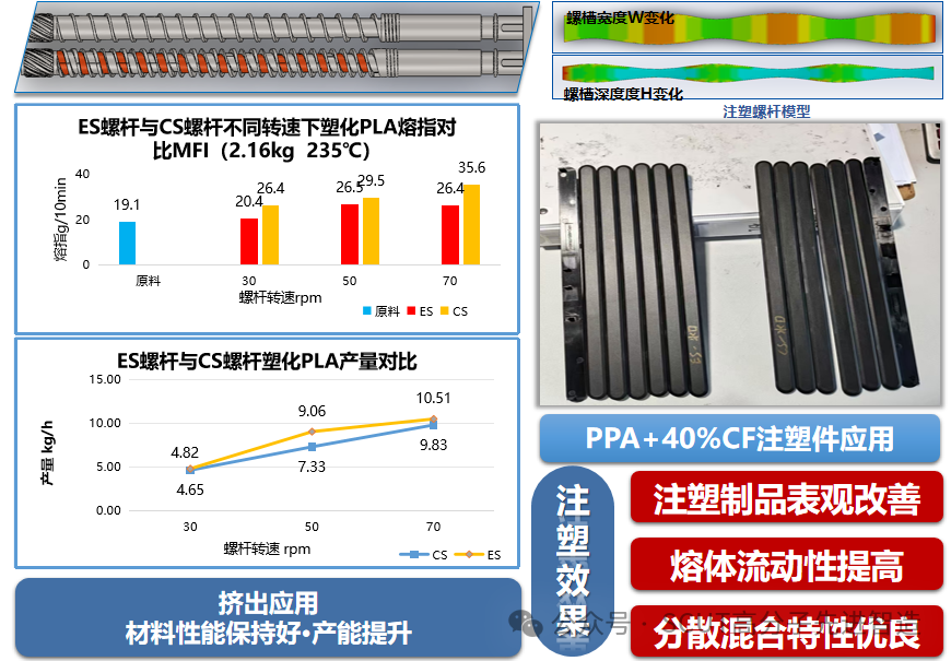 Ø 分散混合特性良好:ES螺杆流道结构可对熔体施加周期性拉、压应力及增加熔体在空间中的流动,相对于常规结构螺杆,ES螺杆表现出分散混合作用强、剪切作用弱、螺杆负载低等特点;